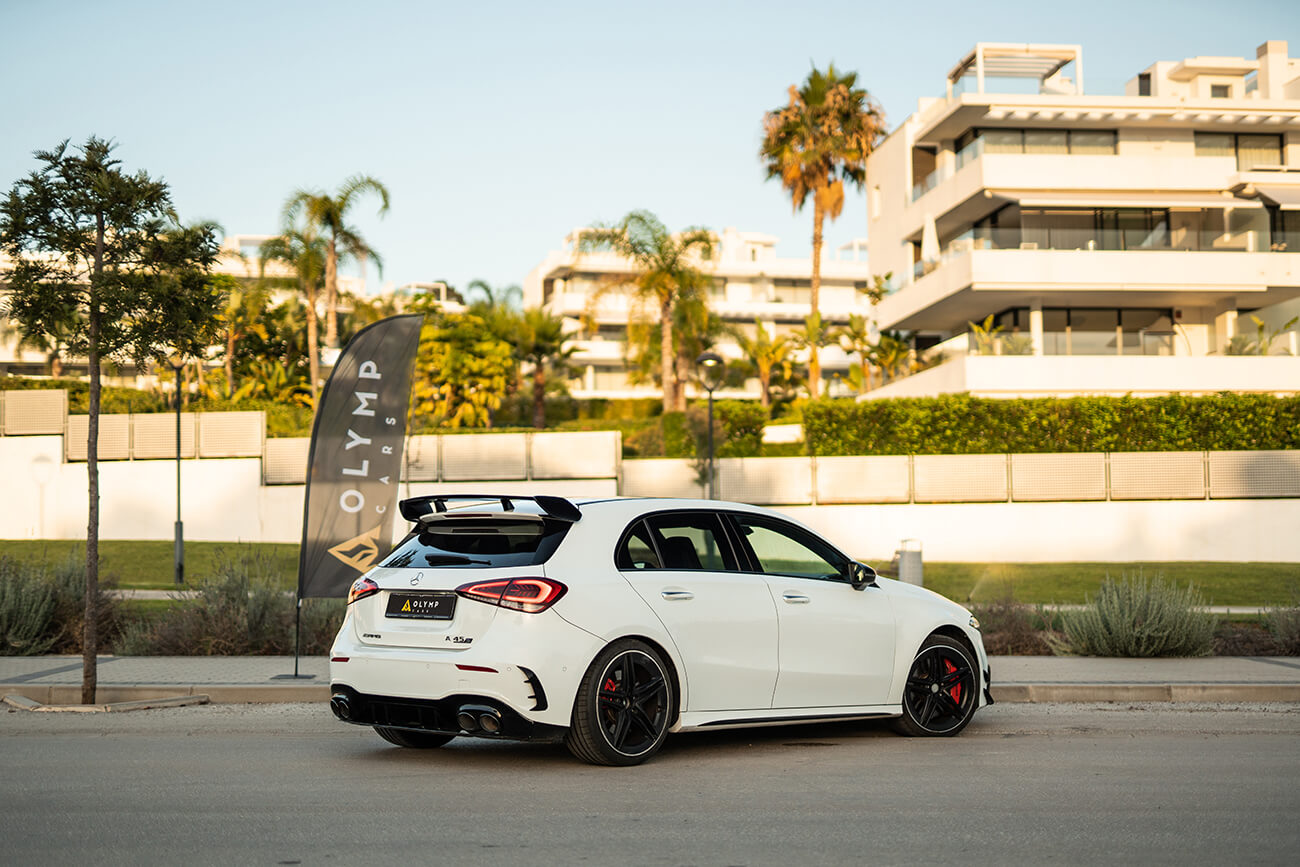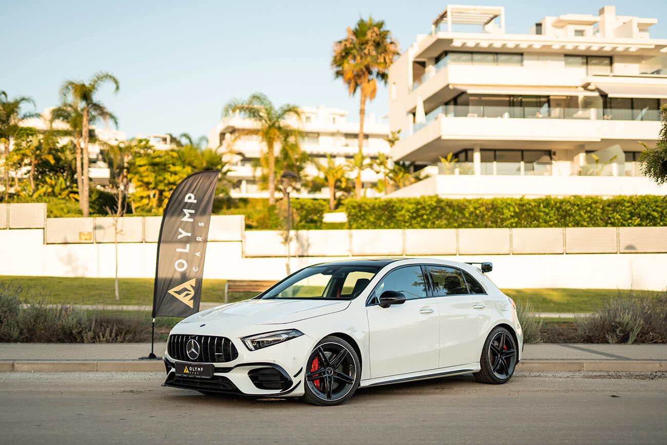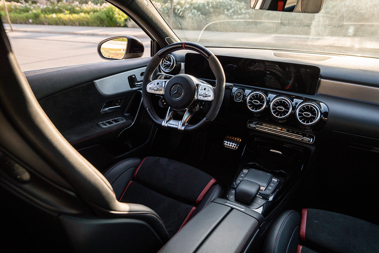 Taking the lead right away: the strikingly sporty design makes the Mercedes-AMG A 45 models clearly distinguishable from the Mercedes-AMG A 35 4MATIC and the AMG Line. The distinctive front apron, the AMG-specific radiator trim and the bonnet with power domes make the Mercedes-AMG A 45 models really stand out. The front wings, which are far wider than those of the Mercedes-AMG A 35 4MATIC, impressively reflect the abundance of driving enjoyment on offer. Optional 48.3 cm (19-inch) cross-spoke forged wheels and red-painted brake callipers round off the powerful package. After all, the power of the newly developed AMG 4-cylinder turbocharged engine needs to be applied to the road as effectively as possible. The new AMG Performance 4MATIC+ with AMG TORQUE CONTROL enables motorsport-like performance. Two separately acting clutches on the rear axle allow fully variable torque distribution to each of the rear wheels exactly as required. This is particularly noticeable in the Mercedes-AMG A 45 S 4MATIC+ when the standard-fit Drift mode is selected. The AMG SPEEDSHIFT DCT 8G transmission is your ideal partner for a sporty driving style. The dual clutch transmission impresses with a RACE START function and motor racing gear changes, but also boasts comfort-oriented gear changes. As such you can enjoy the best of both worlds – racing or comfort on long journeys, you decide!