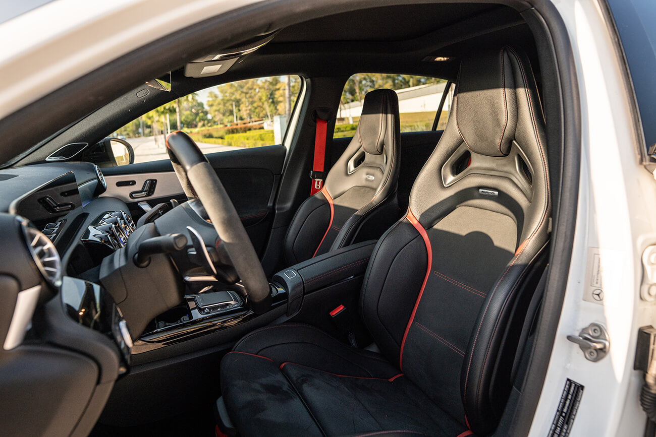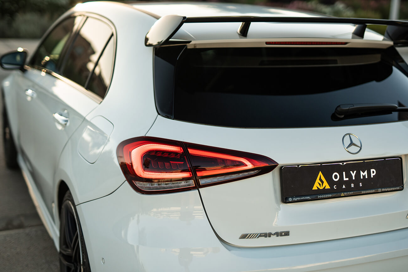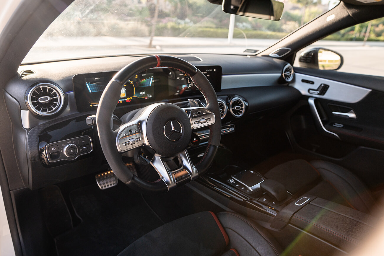 Taking the lead right away: the strikingly sporty design makes the Mercedes-AMG A 45 models clearly distinguishable from the Mercedes-AMG A 35 4MATIC and the AMG Line. The distinctive front apron, the AMG-specific radiator trim and the bonnet with power domes make the Mercedes-AMG A 45 models really stand out. The front wings, which are far wider than those of the Mercedes-AMG A 35 4MATIC, impressively reflect the abundance of driving enjoyment on offer. Optional 48.3 cm (19-inch) cross-spoke forged wheels and red-painted brake callipers round off the powerful package. After all, the power of the newly developed AMG 4-cylinder turbocharged engine needs to be applied to the road as effectively as possible. The new AMG Performance 4MATIC+ with AMG TORQUE CONTROL enables motorsport-like performance. Two separately acting clutches on the rear axle allow fully variable torque distribution to each of the rear wheels exactly as required. This is particularly noticeable in the Mercedes-AMG A 45 S 4MATIC+ when the standard-fit Drift mode is selected. The AMG SPEEDSHIFT DCT 8G transmission is your ideal partner for a sporty driving style. The dual clutch transmission impresses with a RACE START function and motor racing gear changes, but also boasts comfort-oriented gear changes. As such you can enjoy the best of both worlds – racing or comfort on long journeys, you decide!